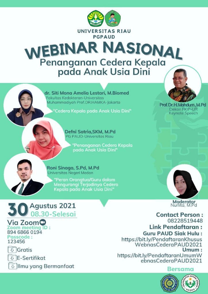 PGPAUD FKIP UNRI menyelenggarakan Webinar Nasional dengan tema “Penanganan Cedera Kepala pada Anak Usia Dini” pada hari Senin, 30 Agustus 2021. Kegiatan Webinar ini dibuka oleh Bapak Dekan FKIP UNRI yaitu Bapak Prof. Dr. H. Mahdum, M.Pd. Pada kesempatan kali ini, PGPAUD FKIP UNRI menghadirkan tiga Pemateri/Narasumber yaitu Ibu dr. Siti Mona Amelia Lestari, M.Biomed seorang Dosen Fakultas Kedokteran Universitas Muhammadiyah Prof. Dr. HAMKA, Ibu Defni Satria, SKM., M.Pd seorang Dosen PGPAUD UNRI dan Bapak Roni Sinaga S.Pd., M.Pd yang merupakan Dosen PGPAUD UNIMED. Webinar ini dipandu oleh Ibu Nurlita, M.Pd selaku Moderator. Webinar Nasional ini dihadari oleh ratusan orang yang terdiri dari Guru/Pendidik, Mahasiswa dan Dosen dari sejumlah daerah. Adapun materi yang disampaikan oleh ketiga Pemateri yaitu “Cedera Kepala pada Anak Usia Dini” yang disampaikan oleh Ibu dr. Siti Mona Amelia Lestari, M.Biomed “Penanganan Cedera Kepala pada Anak Usia Dini” oleh Ibu Defni Satria, SKM., M.Pd dan “Peran Orang tua/Guru dalam Mengurangi Terjadinya Cedera Kepala pada Anak Usia Dini” oleh Bapak Roni Sinaga S.Pd., M.Pd.
